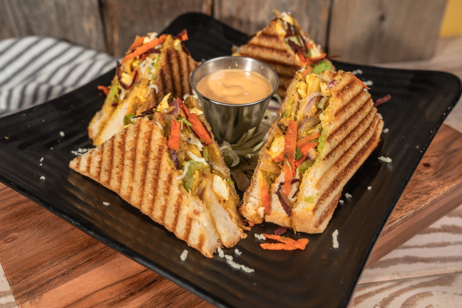 A Chicken Tikka Sandwich features succulent pieces of marinated, spiced chicken grilled to perfection, layered between soft, toasted bread. Paired with fresh vegetables like lettuce, cucumber, and tomatoes, it’s complemented by creamy yogurt or mint chutney, offering a flavorful fusion of bold spices and textures in every bite.