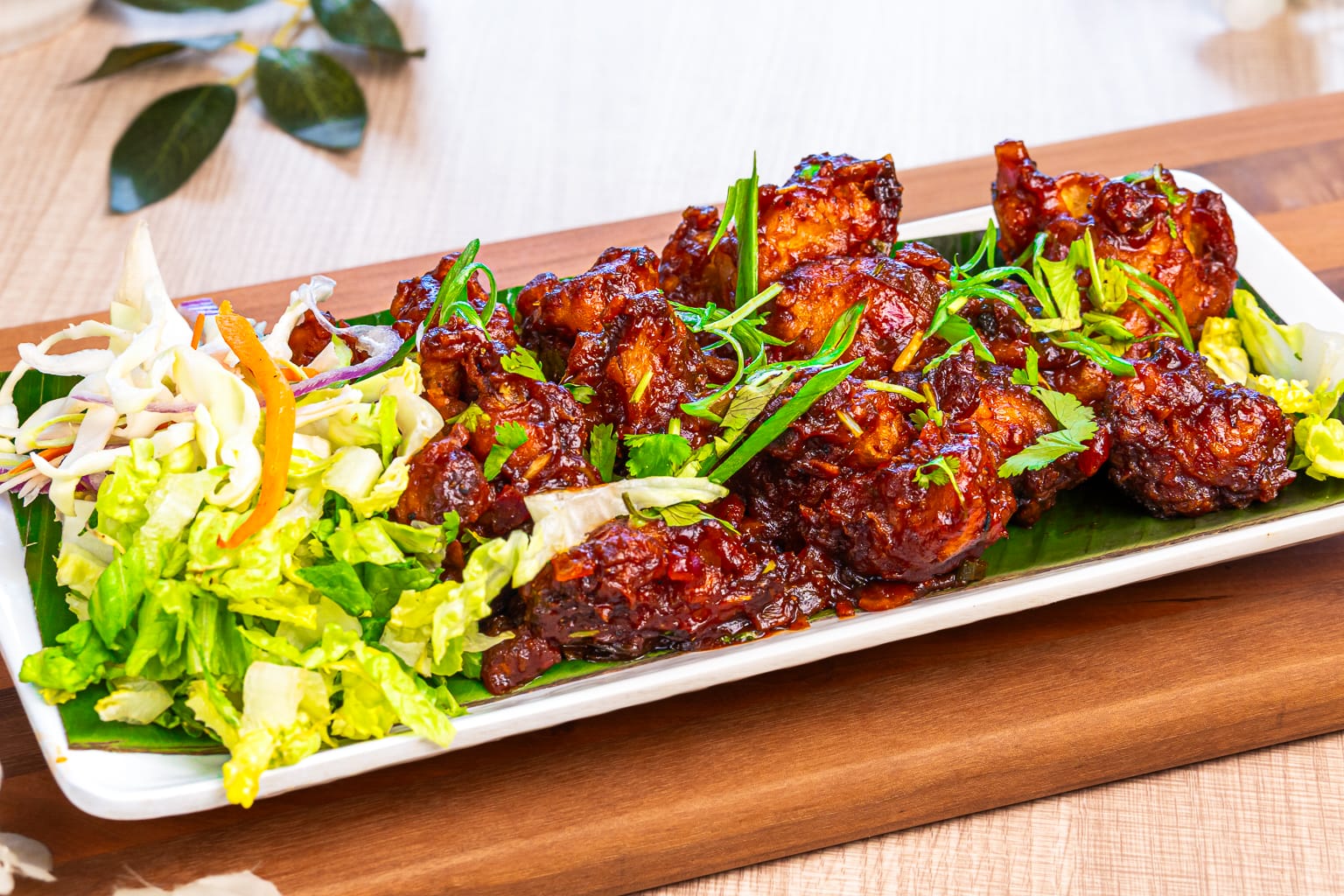 Gobi Manchurian is a popular Indo-Chinese dish made with crispy fried cauliflower florets coated in a tangy, savory sauce. The sauce is a mix of soy sauce, vinegar, ginger, garlic, and spices, offering a perfect balance of sweet, spicy, and umami flavors, often garnished with green onions.