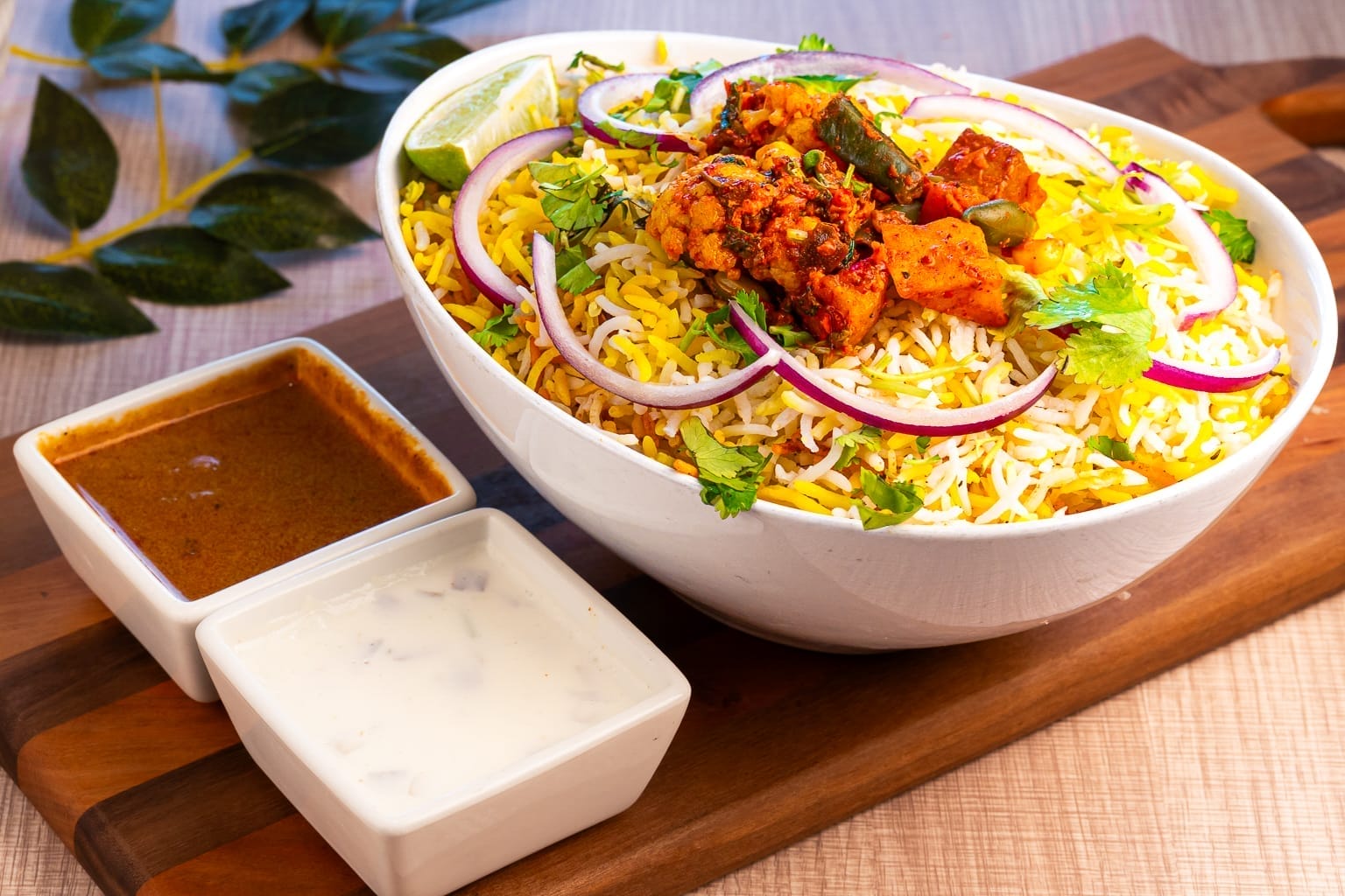 Hyderabadi Veg Dum Biryani is a fragrant, royal dish made by layering basmati rice with spiced vegetables, fresh herbs, and aromatic saffron, then slow-cooking it to perfection. Sealed to trap flavors, this biryani offers a rich, flavorful experience, blending spices, textures, and aromas in every delightful mouthful.