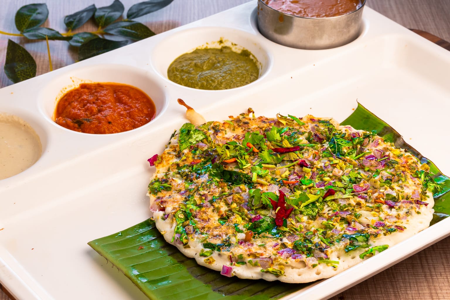 Onion Chilli Uttappam is a savory South Indian pancake made from a fermented batter of rice and urad dal, topped with finely chopped onions and green chilies. It’s pan-fried until golden and crispy, offering a flavorful, spicy, and tangy bite that pairs perfectly with coconut chutney and sambar.