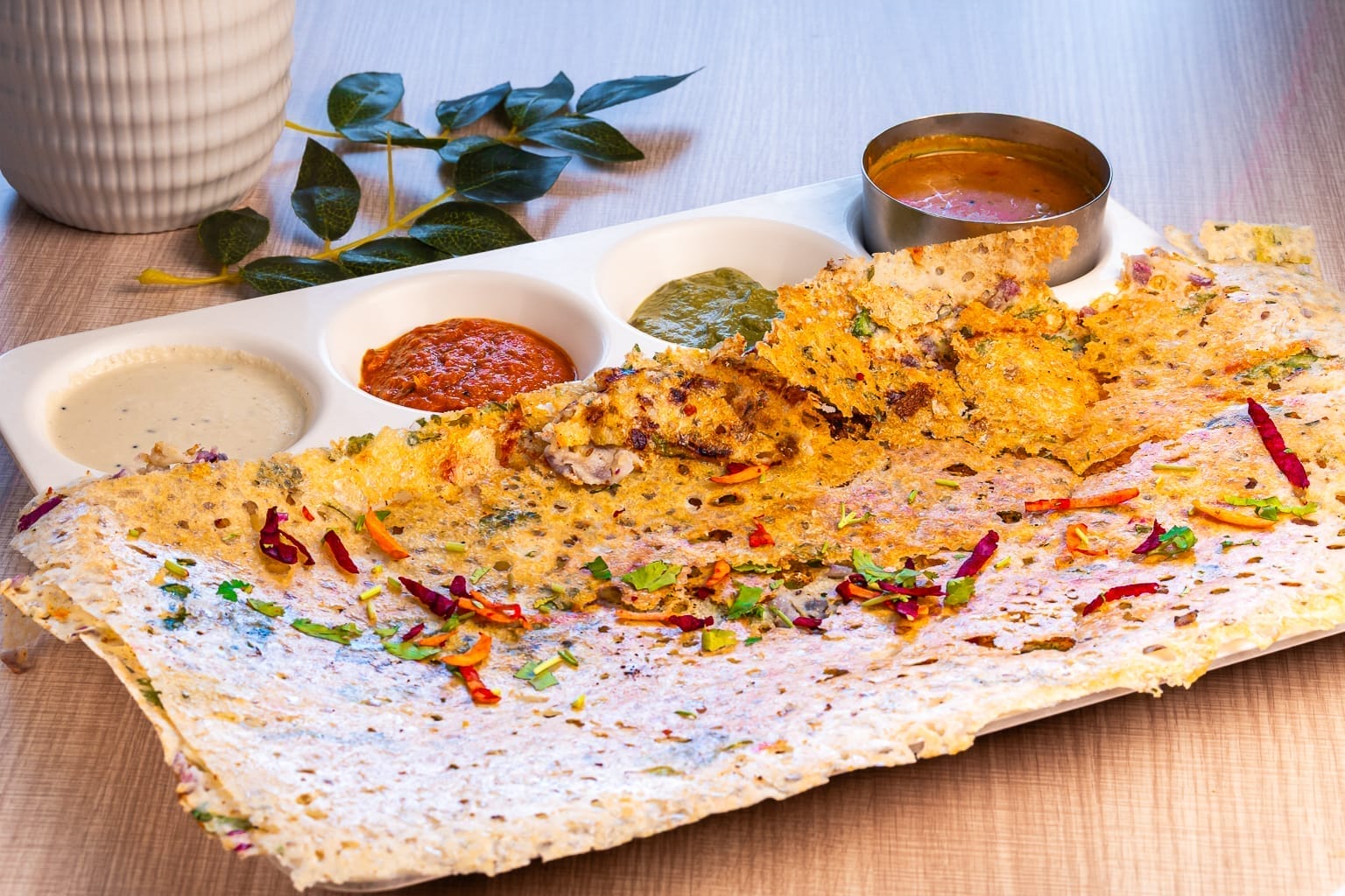 Rava Plain Dosa is a crispy, thin South Indian pancake made from semolina (rava) and rice flour. Light and savory, it is a popular breakfast dish served with chutneys and sambar. Its golden-brown texture and simple yet delightful flavor make it a favorite choice for a quick, satisfying meal.